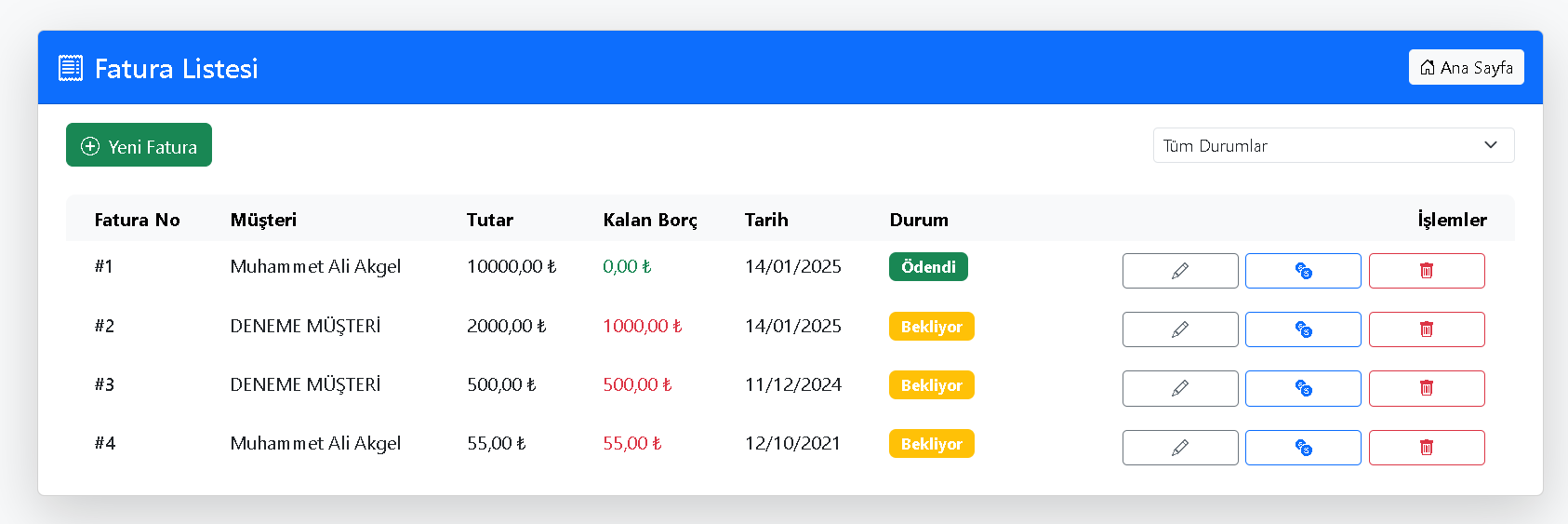 Faturalarınızın Kontrolü Sizin Elinizde: Faturalarınızı kolayca oluşturun, düzenleyin, silin ve takip edin. Hangi faturaların ödendiğini, hangilerinin beklediğini anında görün. Üstelik faturalarınızın kalan borcunu otomatik olarak hesaplayarak size zaman kazandırır.