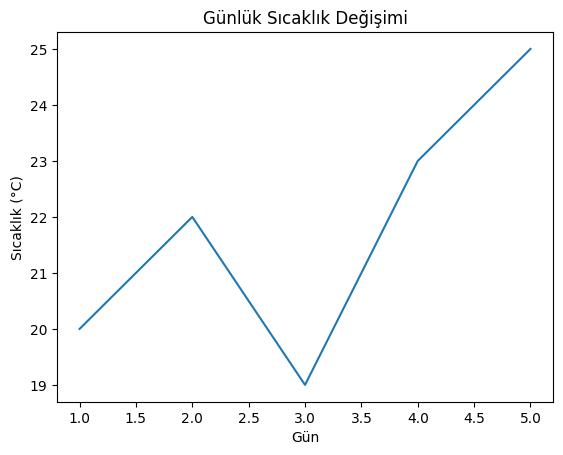 import matplotlib.pyplot as plt gunler = [1, 2, 3, 4, 5]sicaklik = [20, 22, 19, 23, 25]plt.plot(gunler, sicaklik)plt.title("Günlük Sıcaklık Değişimi")plt.xlabel("Gün")plt.ylabel("Sıcaklık (°C)")plt.show()Grafik Çıktısı