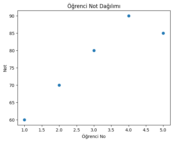 ogrenci = [1, 2, 3, 4, 5]notlar = [60, 70, 80, 90, 85] plt.scatter(ogrenci, notlar)plt.title("Öğrenci Not Dağılımı")plt.xlabel("Öğrenci No")plt.ylabel("Not")plt.show()Grafik Çıktısı