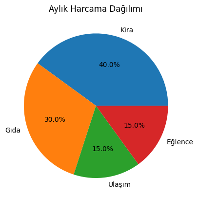 etiketler = ["Kira", "Gıda", "Ulaşım", "Eğlence"]harcama = [40, 30, 15, 15] plt.pie(harcama, labels=etiketler, autopct="%1.1f%%")plt.title("Aylık Harcama Dağılımı")plt.show()Grafik Çıktısı