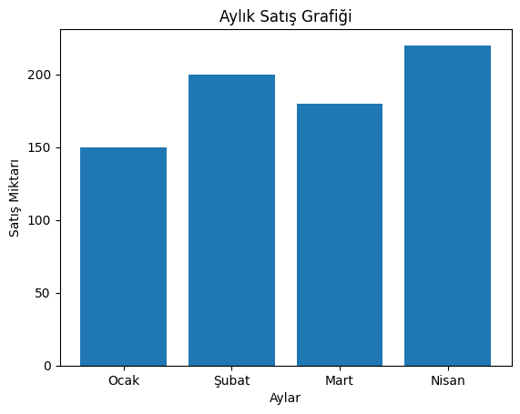 aylar = ["Ocak", "Şubat", "Mart", "Nisan"]satislar = [150, 200, 180, 220] plt.bar(aylar, satislar)plt.title("Aylık Satış Grafiği")plt.xlabel("Aylar")plt.ylabel("Satış Miktarı")plt.show()Grafik Çıktısı